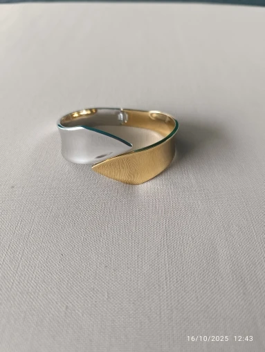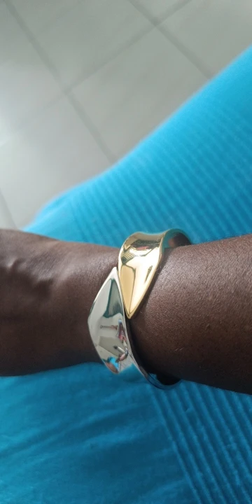 Can't decide between gold and silver? Don't. The Architectural Two-Tone Hinge Cuff masters the art of the mix. With its sharp, geometric lines and fluid "liquid metal" surface, this piece feels less like an accessory and more like a piece of modern sculpture. It bridges the gap between your gold rings and silver earrings, tying your entire look together with bold confidence.